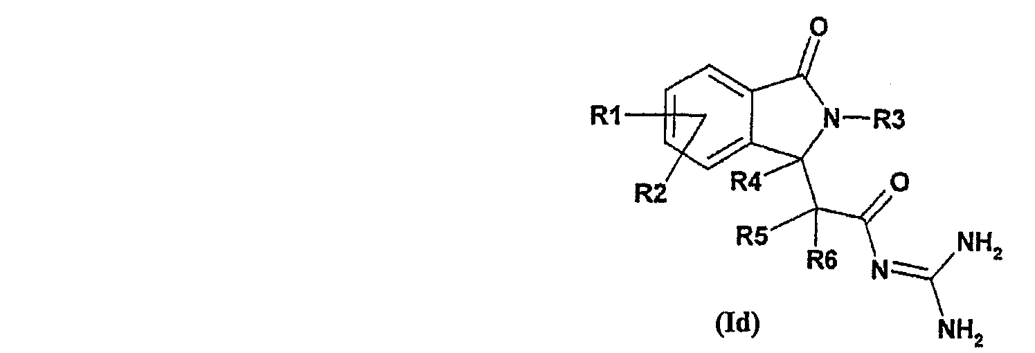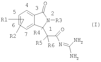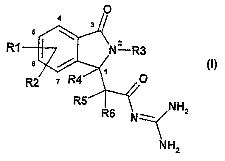 1. Соединения формулы I в которой R1 и R2 независимо друг от друга представляют собой водород, алкил, имеющий 1, 2, 3 или 4 атома углерода, F, Cl, Br, алкокси, имеющий 1, 2, 3 или 4 атома углерода, S(O)nR7, полифторалкил, имеющий 1, 2, 3 или 4 атома углерода, или полифторалкокси, имеющий 1, 2 или 3 атома углерода; n равно 2; R3 представляет собой группу типа Alk-R8 или циклоалкил, имеющий 3, 4, 5, 6, 7 или 8 атомов углерода; Alk представляет собой алкил, имеющий 1, 2, 3, 4 или 5 атомов углерода в линейной или разветвленной цепи; R8 представляет собой водород, циклоалкил, имеющий 3, 4, 5, 6, 7 или 8 атомов углерода, полифторалкил, имеющий 1, 2, 3 или 4 атома углерода, фенил или ОН; R4, R5 и R6 независимо друг от друга представляют собой водород или линейный или разветвленный алкил, имеющий 1, 2, 3 или 4 атома углерода; R7 представляет собой линейный или разветвленный алкил, имеющий 1, 2, 3 или 4 атома углерода; и их рацемические смеси, энантиомеры и диастереоизомеры и их смеси, их таутомеры и их фармацевтически приемлемые соли. 2. Соединения формулы I по п.1, где R1 и R2 независимо друг от друга представляют собой водород, алкил, имеющий 1, 2, 3 или 4 атома углерода, F, Cl, Br, алкокси, имеющий 1, 2, 3 или 4 атома углерода, полифторалкил, имеющий 1, 2, 3 или 4 атома углерода, или полифторалкокси, имеющий 1, 2 или 3 атома углерода, R3 представляет собой группу типа Alk-R8 или циклоалкил, имеющий 3, 4, 5, 6, 7 или 8 атомов углерода, Alk представляет собой алкил, имеющий 1, 2, 3, 4 или 5 атомов углерода в линейной или разветвленной цепи, R8 представляет собой водород, циклоалкил, имеющий 3, 4, 5, 6, 7 или 8 атомов углерода, или полифторалкил, имеющий 1, 2, 3 или 4 атома углерода; R4, R5 и R6 независимо друг от друга представляют водород или линейный или разветвленный алкил, имеющий 1, 2, 3 или 4 атома углерода; и их рацемические смеси, энантиомеры и диастереоизомеры и их смеси, их таутомеры и их фармацевтически приемлемые соли. 3. Соединение по п.1 или 2, отличающееся тем, что оно выбрано из группы, включающей N-[2-(2-изобутил-3-оксо-2,3-дигидро-1Н-изоиндол-1-ил)-2-метилпропионил]гуанидин, N-[2-(2-циклопропилметил-3-оксо-2,3-дигидро-1Н-изоиндол-1-ил)-2-метилпропионил]гуанидин, N-[(3-оксо-2-(3,3,3-трифторпропил)-2,3-дигидро-1Н-изоиндол-1-ил)ацетил]гуанидин, N-[(3-оксо-2-(4,4,4-трифторбутил)-2,3-дигидро-1Н-изоиндол-1-ил)ацетил]гуанидин, N-[(3-оксо-2,3-дигидро-1Н-изоиндол-1-ил)ацетил]гуанидин, N-[(2-изобутил-7-метил-3-оксо-2,3-дигидро-1Н-изоиндол-1-ил)ацетил]гуанидин, N-[(4-амино-2-изобутил-3-оксо-2,3-дигидро-1Н-изоиндол-1-ил)ацетил]гуанидин, N-[(5-амино-2-изобутил-3-оксо-2,3-дигидро-1Н-изоиндол-1-ил)ацетил]гуанидин, N-[(6-амино-2-изобутил-3-оксо-2,3-дигидро-1Н-изоиндол-1-ил)ацетил]гуанидин, N-[(7-амино-2-изобутил-3-оксо-2,3-дигидро-1Н-изоиндол-1-ил)ацетил]гуанидин, N-[(4-гидрокси-2-изобутил-3-оксо-2,3-дигидро-1Н-изоиндол-1-ил)ацетил]гуанидин, N-[(5-гидрокси-2-изобутил-3-оксо-2,3-дигидро-1Н-изоиндол-1-ил)ацетил]гуанидин, N-[(6-гидрокси-2-изобутил-3-оксо-2,3-дигидро-1Н-изоиндол-1-ил)ацетил]гуанидин, N-[(7-гидрокси-2-изобутил-3-оксо-2,3-дигидро-1Н-изоиндол-1-ил)ацетил]гуанидин, N-[(4,7-дихлор-2-изобутил-3-оксо-2,3-дигидро-1H-изоиндол-1-ил)ацетил]гуанидин, N-[(4-фтор-2-изобутил-3-оксо-2,3-дигидро-1Н-изоиндол-1-ил)ацетил]гуанидин, N-[(5-фтор-2-изобутил-3-оксо-2,3-дигидро-1Н-изоиндол-1-ил)ацетил] гуанидин, N-[(6-фтор-2-изобутил-3-оксо-2,3-дигидро-1Н-изоиндол-1-ил)ацетил]гуанидин, N-[(4,5-дифтор-2-изобутил-3-оксо-2,3-дигидро-1Н-изоиндол-1-ил)ацетил]гуанидин, N-[(6,7-дифтор-2-изобутил-3-оксо-2,3-дигидро-1Н-изоиндол-1-ил)ацетил]гуанидин, 