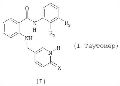Изобретение относится к новым производным амидов антраниловой кислоты, методикам их получения, применению их в способе лечения человеческого или животного организма, применению их по отдельности или в комбинации с одним или несколькими фармацевтически активными соединениями, в особенности для терапии новообразования, такого как опухолевое заболевание, ретинопатии и возрастной дегенерации роговицы с появлением пятен; к способу лечения таких заболеваний у млекопитающих, особенно у человека, и к применению таких соединений по отдельности или в комбинации с одним или несколькими другими фармацевтически активными соединениями при получении фармацевтического препарата (лекарственного средства) для лечения новообразования, ретинопатии или возрастной дегенерации роговицы с появлением пятен. Известно, что некоторые заболевания ассоциированы с разрегулированным ангиогенезом, например заболевания, вызванные образованием новых сосудов глаза, такие как ретинопатии (включая диабетическую ретинопатию), возрастная дегенерация роговицы с появлением пятен, псориаз, гемангиобластома, гемангиома, артериосклероз, воспалительные заболевания, такие как ревматоидные или ревматические воспалительные болезни, особенно артриты, такие как ревматоидный артрит, или другие хронические воспалительные нарушения, такие как хроническая астма, артериальный или посттрансплантационный атеросклероз, эндометриоз и особенно новообразования, например так называемые солидные опухоли и “текучие” опухоли (такие, как лейкозы). В центре сети, регулирующей рост и дифференцировку сосудистой системы и ее компонентов в ходе эмбрионального развития, нормального роста и при огромном количестве патологических аномалий и болезней лежит ангиогенный фактор, известный как фактор роста сосудистого эндотелия (VGEF), димерный, связанный дисульфидным мостиком гликопротеин с массой 46 кДа вместе с его клеточными рецепторами (смотри Breier G. и др., Trends in Cell Biology, 6, 454-6 [1996]). Рецепторы VEGF представляют собой трансмембранные рецепторные тирозинкиназы. Известны различные типы рецепторов VEGF, например VEGFR-1, VEGFR-2 и VEGFR-3. Большое количество человеческих опухолей, особенно глиомы и карциномы, экспрессируют высокие уровни VEGF и его рецепторов. Это привело к гипотезе о том, что VEGF, высвобождаемый опухолевыми клетками, мог бы стимулировать рост капиллярных кровеносных сосудов и пролиферацию опухолевого эндотелия паракринным способом и, таким образом, через улучшенное кровоснабжение ускорять рост опухоли. Прямое доказательство роли VEGF как фактора опухолевого ангиогенеза in vivo получено из исследований, в которых активность VEGF была ингибирована антителами. Ангиогенез считается абсолютно необходимым условием для тех опухолей, которые вырастают за пределы максимального диаметра 1-2 мм; до этого предела кислород и питательные вещества попадают в опухоль путем диффузии. Три основных механизма играют важную роль в активности ингибиторов ангиогенеза, направленной против опухолей: (1) ингибирование роста сосудов, особенно капилляров, в опухолях с покоящимися сосудами, в результате чего нет общего опухолевого роста благодаря балансу, который достигается между апоптозом и пролиферацией; (2) предотвращение миграции опухолевых клеток из-за отсутствия тока крови в опухоли и из них 