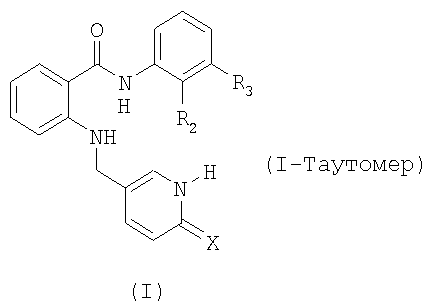 где R1 означает водород или (низш.)алкил; R2 означает водород или (низш.)алкил; R3 означает перфтор(низш.)алкил; и Х означает кислород или серу; или его N-оксид либо его таутомер, или соль такого амида антраниловой кислоты, ее N-оксид или ее таутомер. 2. Амид антраниловой кислоты формулы I по п.1, где R1 означает водород или (низш.)алкил, R2 означает водород или низший алкил, R3 означает трифторметил, и Х означает кислород, или его N-оксид или его таутомер, или соль такого амида антраниловой кислоты, ее N-оксид или ее таутомер. 3. Амид антраниловой кислоты формулы I по п.1, где R1 означает водород или метил, R2 означает водород или метил, R2 означает трифторметил, и Х означает кислород, или его таутомер, или соли такого амида антраниловой кислоты, или ее таутомер. 4. Амид антраниловой кислоты формулы I по п.1, выбранный из гидрохлоридной соли 2-[[6-метокси-3-пиридинил]метил]амино-N-[3-(трифторметил)фенил]бензамида, 2-[[6-метокси-3-пиридинил]метил]амино-N-[2-метил-3-(трифторметил)фенил]-бензамида, 2-[[(1,6-дигидро-6-оксо-3-пиридинил)метил]амино]-N-[3-(трифторметил)фенил]бензамида и 2-[[(1,6-дигидро-6-оксо-3-пиридинил)метил]амино]-N-[2-метил-3-(трифторметил)фенил] бензамида или его N-оксида, или его таутомера, или соли такого амида антраниловой кислоты, ее N-оксида или ее таутомера. 5. Амид антраниловой кислоты формулы I по одному из пп.1-4 или его N-оксид, или его таутомер, или его фармацевтически приемлемая соль, предназначенный для использования при лечении новообразования, ретинопатии или возрастной дегенерации с появлением пятен на роговице у человека или млекопитающего. 6. Применение амида антраниловой кислоты формулы I по п.1, или его N-оксида, или его таутомера, или его фармацевтически приемлемой соли соединения для получения фармацевтического продукта, обладающего ингибирующей активностью в отношении тирозинкиназного рецептора VEGF. 7. Способ лечения заболевания новообразованием, которое откликается на ингибирование активности тирозинкиназного рецептора VEGF, включающий введение теплокровному млекопитающему, нуждающемуся в таком лечении, эффективного количества амида антраниловой кислоты формулы I по п.1 или его N-оксида, или его таутомера, или фармацевтически приемлемой соли такого амида антраниловой кислоты, или ее N-оксида, или ее таутомера. 8. Фармацевтический препарат, обладающий ингибирующей активностью в отношении тирозинкиназного рецептора VEGF и включающий амид антраниловой кислоты формулы I по одному из пп.1-4, или его N-оксид, или его таутомер, или его фармацевтически приемлемую соль и, по меньшей мере, один фармацевтически приемлемый носитель. 9. Способ получения амида антраниловой кислоты формулы I