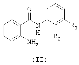 где R2 и R3 имеют значения, определенные для формулы I, например, в присутствии конденсирующего агента, такого как дициклогексилкарбодиимид, при температуре между 0°С и 50°С, предпочтительно при комнатной температуре. Все остальные исходные вещества являются известными, могут быть получены в соответствии с известными методиками или получаются для продажи; в частности, они могут быть получены с использованием методик, которые описаны в примерах. При получении исходных веществ имеющиеся функциональные группы, которые не участвуют в реакции, должны быть защищены, если это необходимо. Предпочтительные защитные группы, их введение и их удаление описано в разделе “Защитные группы” или в примерах. Следующие примеры служат для иллюстрации изобретения без ограничения его объема. Примеры Стандартный пример 1: 2-[[6-метокси-3-пиридинил]метил]амино-N-[4-бром-3-(трифторметил)фенил]бензамид (нет в формуле изобретения) Цианборгидрид натрия (8,80 г, 95%-ный, 133 ммоля) прибавляли порциями в течение 30 мин к перемешиваемой смеси уксусной кислоты (3,8 мл), 6-метокси-3-пиридинкарбоксальдегида (Fluka, Buchs, Switzerland; 7,80 г, 57 ммолей) и 2-амино-N-(4-бром-3-трифторметилфенил)бензамида (этап 1.2; 13,65 г, 38 ммолей) в метаноле (380 мл) при 25°С. Смесь перемешивали в течение 16 ч. Растворитель упаривали при пониженном давлении, получая остаток, который обрабатывали насыщенным водным раствором бикарбоната натрия (500 мл) и экстрагировали дихлорметаном (3×150 мл). Объединенные экстракты сушили над сульфатом натрия, фильтровали и растворитель упаривали при пониженном давлении, получая неочищенный продукт, который очищали колоночной хроматографией на силикагеле, элюент 5% этилацетат в дихлорметане и перекристаллизовывали из смеси диэтиловый эфир-гексан, получая заглавное соединение, в виде твердого кристаллического вещества бежевого цвета, tпл 101-103°С. Этап 1.1: 2-нитро-N-(4-бром-3-трифторметилфенил)бензамид Раствор 3-амино-6-бромбензотрифторида (Fluka, Buchs, Switzerland; 24,0 г, 100 ммолей) в этилацетате (240 мл) прибавляли к перемешиваемому водному раствору гидроксида натрия (110 мл, 1М) при комнатной температуре. Затем перемешиваемый раствор обрабатывали по каплям в течение 30 мин раствором 2-нитробензоилхлорида (Fluka, Buchs, Switzerland; 14,5 мл, 110 ммолей) в этилацетате (150 мл). Полученную смесь затем перемешивали в течение 30 мин при температуре окружающей среды. Смесь экстрагировали этилацетатом (3×100 мл) и объединенные экстракты промывали последовательно хлористоводородной кислотой (2×100 мл, 2М), водой (2×100 мл), насыщенным водным раствором бикарбоната натрия (2×100 мл) и насыщенным водным раствором хлорида натрия (1×100 мл), сушили над сульфатом магния, фильтровали и растворитель упаривали при пониженном давлении, получая неочищенный продукт, который очищали перекристаллизацией из смеси этилацетат-гексан, получая заглавное соединение в виде твердого кристаллического вещества бежевого цвета, tпл 157-158°С. Этап 1.2: 2-амино-N-(4-бром-3-трифторметилфенил)бензамид Раствор 2-нитро-N-(4-бром-3-трифторметилфенил)бензамида (промежуточное соединение 1а; 32 г, 82 ммоля) в метаноле (1000 мл) гидрировали при атмосферном давлении над Ni-Ренея (6 г) при 21°С. Вычисленное количество водорода поглотилось через 7 ч. Смесь фильтровали и растворитель упаривали при пониженном давлении, получая неочищенный продукт, который очищали перекристаллизацией из смеси диэтил