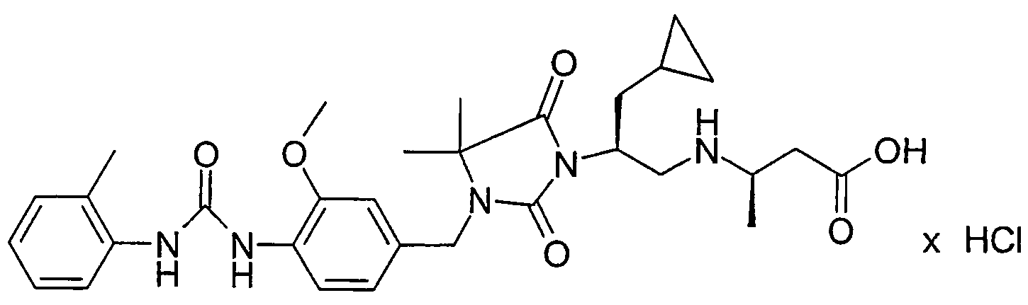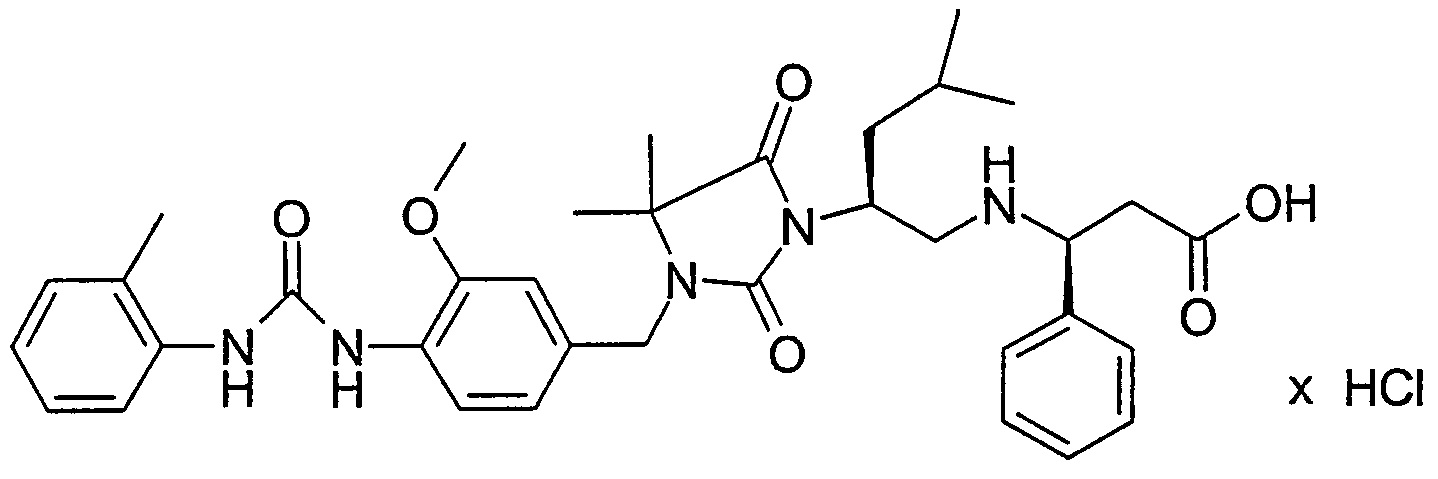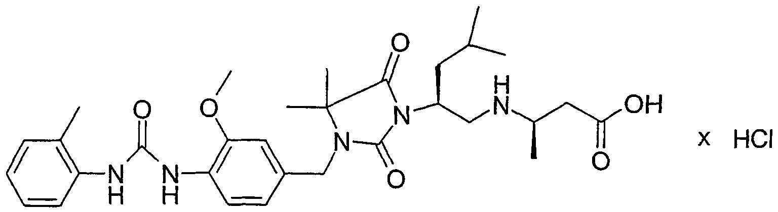 ES(+)-MS: 582,5 (3-(2-(4,4-диметил-3-(4-(3-(2-метилфенил)уреидо)-3-метоксибензил)-2,5-диоксоимидазолидин-1-ил)-4-метилпентиламино)масляная кислота + Н)+.
