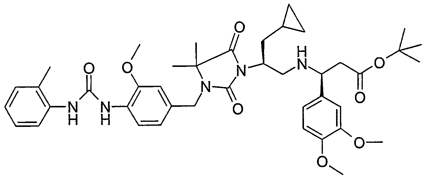 TOF ES(+)-MS: 730,58 (Этил-3-(2-(4,4-диметил-3-(4-(3-(2-метилфенил)уреидо)-3-метоксибензил)-2,5-диоксоимидазолидин-1-ил)-3-циклопропилпропиламино)-3-(3,4-диметоксифенил)пропионат + Н)+.