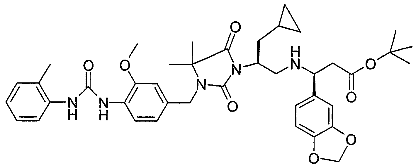 TOF ES(+)-MS: 686,51 (3-(2-(4,4-диметил-3-(4-(3-(2-метилфенил)уреидо)-3-метоксибензил)-2,5-диоксоимидазолидин-1-ил)-3-циклопропилпропиламино)-3-(3,4-метилендиоксифенил)пропионовая кислота + Н)+.