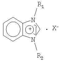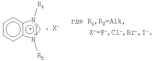 Иодид 1,3-диэтилбензимидазолия. 59 г (0,5 М) бензимидазола и 68 г (0,5 М) ацетата натрия трехводного помещают в 150 мл о-ксилола, добавляют 156 г (1 М, 79,6 мл) йодистого этила и кипятят реакционную смесь в течение 3 часов. Охлаждают на льду, полученный кристаллический продукт промывают ледяной водой, отфильтровывают и высушивают 24 часа при +55°С. Мелкие кристаллы от белого до светло-желтого или светло-розового цвета с т.пл. 242-244°С. Выход 74%. Строение полученного соединения подтверждено элементным анализом, спектром ПМР (см. чертеж). Найдено: N 9,23%, I 43,7%. Вычислено: N 9,27%. I 42,0%.