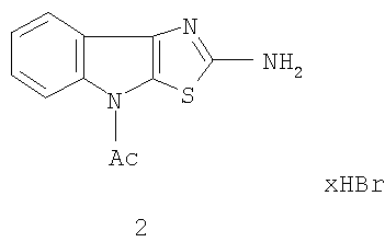 для защиты организма от воздействия гипобарической и гемической гипоксии и печени от отравления четыреххлористым углеродом. Указанное свойство позволяет предполагать возможность применения этого соединения для предотвращения и лечения у людей острых ингаляционных отравлений парами четыреххлористого углерода. Широкое применение четыреххлористого углерода в промышленности, сельском хозяйстве и военном деле делает актуальным поиск фармакологических средств, защищающих организм от воздействия этого токсиканта. Для восстановления функции печени применяют эссенциале, однако его активность недостаточна. Ранее была установлена гепатопротекторная активность гидробромида 2-амино-4-ацетилтиазоло[5,4-b]индола (Патент 2076867 РФ, МКИ3 6 С07D 478/04, А61К 31/40. Гидробромид 2-амино-4-ацетилтиазоло[5,4-b]индола, защищающий печень от отравления четыреххлористым углеродом и способ его получения / Вележева B.C., Мельман А.И.. Томчин А.Б., Смирнов А.В., Оковитый С.В., Гайворонская В.В. (РФ). – 5042409/04; Заявлено 19.05.92.), формула 2.