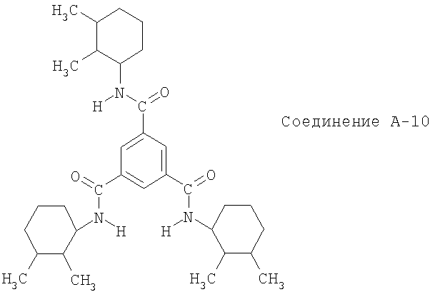 Пример II. 2,5 кг полипропиленового порошка (продукт Moplen FL F 20 (RTM) фирмы Montell (RTM)) смешивают до гомогенного состояния в высокоскоростном смесителе с 0,10% трис(2,4-ди-трет-бутилфенил)фосфита, 0,05% пентаэритрит-тетракис-3-(3,5-ди-трет-бутил-4-гидроксифенил)пропионата, 0,10% стеарата кальция и 0,20% соединения А-10. Полученную смесь пропускают через двухшнековый экструдер фирмы Berstorff (RTM) при температуре до 240°С. После пропускания экструдата через водяную баню для охлаждения его гранулируют. Литьевое формование (пример IIa). Пластины размером 90 мм × 85 мм × 2 мм получают формованием из указанных гранул на установке для литьевого формования (Arburg 320 S (RTM)) при температуре до 240°С (температура в форме 50°С). Прессование (примеры IIб-IIе). Пластины размером 140 мм × 240 мм × 2 мм формуют прессованием из гранул. Пример IIб. 55 г гранул формуют при t1=240°С в течение 15 мин на прессе для формования из расплава Suter LP 322 (RTM). Затем формованную композицию на основе полипропиленовой смолы помещают во второй пресс для формования из расплава (Suter LP 322 (RTM)) при температуре t2=60°C. Образцы прессуют при давлении 10 бар и отжигают/кристаллизуют в течение 5 мин. Пример IIв. 55 г гранул формуют при t1=240°C в течение 15 мин на прессе для формования из расплава Suter LP 322 (RTM). Затем формованную композицию на основе полипропиленовой смолы помещают во второй пресс для формования из расплава (Suter LP 322 (RTM)) при температуре t2=80°C. Образцы прессуют при давлении 10 бар и отжигают/кристаллизуют в течение 10 мин. Пример IIг. 55 г гранул формуют при t1=240°C в течение 15 мин на прессе для формования из расплава Suter LP 322 (RTM). Затем формованную композицию на основе полипропиленовой смолы помещают во второй пресс для формования из расплава (Suter LP 322 (RTM)) при температуре t2=100°C. Образцы прессуют при давлении 10 бар и отжигают/кристаллизуют в течение 30 мин. Пример IIд. 55 г гранул формуют при t1=240°C в течение 15 мин на прессе для формования из расплава Suter LP 322 (RTM). Затем формованную композицию на основе полипропиленовой смолы помещают во второй пресс для формования из расплава (Suter LP 322 (RTM)) при температуре t2=110°C. Образцы прессуют при давлении 10 бар и отжигают/кристаллизуют в течение 60 мин. Пример IIе. 55 г гранул формуют при t1=240°C в течение 15 мин на прессе для формования из расплава Suter LP 322 (RTM). Затем формованную композицию на основе полипропиленовой смолы помещают во второй пресс для формования из расплава (Suter LP 322 (RTM)) при температуре t2=120°C. Образцы прессуют при давлении 10 бар и отжигают/кристаллизуют в течение 120 мин. Содержание кристаллической Рентгеновское рассеяние в больших углах Определение содержания ДСК Анализ свойств кристаллической формы в различных смесях и контрольных образцах проводят по стандартным методикам на приборе для ДСК ТА Instruments (RTM) (модель 2920), действующем в атмосфере сухого азота. Приблизительно от 5 до 10 мг образца помещают в алюминиевую чашку, нагревают от температуры окружающей среды до 240°С со скоростью 10 К/мин, выдерживают при 240°С в течение 5 мин и затем последовательно охлаждают со скоростью 10 К/мин до температуры окружающей среды. Данные представлены в виде температур кристаллизации, которые определяют по температуре экзотермических пиков (минимум преобладающего пика) на термограммах, записанных после охлаждения. Температура перекристаллизации (tкр) полипропиленовой смолы (соединение (1)), не содержащей агентов зародышеобр