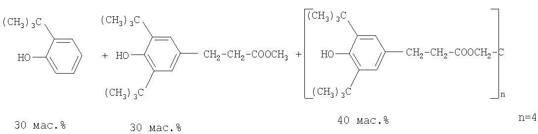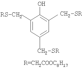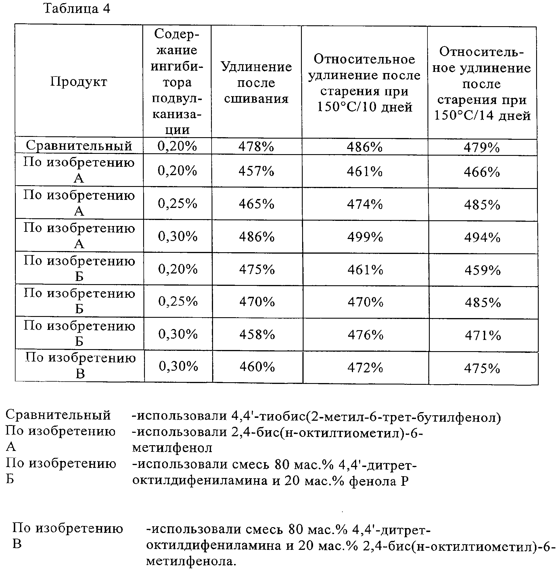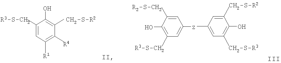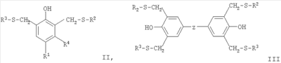 Наиболее предпочтительный жидкий ингибитор подвулканизации формулы I представляет собой 2,4-бис(н-октилтиометил)-6-метилфенол или 2,4-бис(н-додецилтиометил)-6-метилфенол. Что касается US 5008459, то ингибитор подвулканизации представляет собой соединение формулы II или III или их смеси в которых R1, R2, R3 и R4 имеют значения, указанные выше, a Z обозначает -S-, -CH2-, -СН(СН3)- или -С(СН3)2-. В качестве типичных примеров соединений формулы II можно рассматривать перечисленные ниже соединения: 2,6-бис-(2′-гидроксиэтилтиометил)-4-метилфенол, 2,6-бис-(2′,3′-дигидроксипропилтиометил)-4-метилфенол, 2,6-бис-(2′-метиламинокарбонилэтилтиометил)-4-фенилфенол, 2,6-бис-(N,N-диэтиламинокарбонилэтилтиометил)-4-аллилфенол, 2,6-бис-(н-октилтиометил)-4-метилфенол, 2,6-бис-(н-додецилтиометил)-4-метилфенол, 2,6-бис-(н-октилтиометил)-4-трет-бутилфенол, 2,6-бис-(н-додецилтиометил)-4-трет-бутилфенол, 2,6-бис-(н-октилтиометил)-4-(1′,1′,3′,3′-тетраметилбутил)фенол, 2,6-бис-(трет-нонилтиометил)-4-трет-бутилфенол, 2,6-бис-(трет-додецилтиометил)-4-трет-октилфенол, 2,6-бис-(бензилтиометил)-6-метилфенол, 2,6-бис-(фенилтиометил)-4-трет-бутилфенол, 2,6-бис-(2′-этилгексилоксикарбонилметилтиометил)-4-циклогексилфенол, 2,6-бис-(2′-изооктилоксикарбонилметилтиометил)-4-циклогексилфенол, 2,6-бис-(н-октадецилоксикарбонилметилтиометил)-4-пропаргилфенол, 2,6-бис-[2′-(2″-этилгексилоксикарбонил)этилтиометил]-4-трет-бутилфенол. В качестве типичных примеров соединений формулы III можно рассматривать перечисленные ниже соединения: 2,2-бис-[4′,4″-дигидрокси-3′,3″,5’5″-тетракис(н-октилтиометил)фенил]пропан, 2,2-бис-[41,4″-дигидрокси-3′,3″,5′,5″-тетракис(н-додецилтиометил)фенил]пропан, бис-[4,4′-дигидрокси-3,3′,5,5′-тетракис(н-октилтиометил)фенил]метан, бис-[4,4′-дигидрокси-3,3′,5,5′-тетракис(н-додецилтиометил)фенил]метан, 2,2-бис-[4′,4″-дигидрокси-3′,3″,5′,5″-тетракис(2-этилгексилоксикарбонилметилтиометил)фенил]пропан, 2,2-бис-[4′,4″-дигидрокси-3′,3″,5′,5″-тетракис(2-изооктилоксикарбонилметилтиометил)фенил]пропан. Что касается US 5091099, то ингибитор подвулканизации представляет собой смесь, включающую амин, выбранный из дифениламина, 4-трет-бутилдифениламина, 4-трет-октилдифениламина, 4,4′-дитрет-бутилдифениламина, 2,4,4′-тристрет-бутилдифениламина, 4-трет-бутил-4′-трет-октилдифениламина, о,о’-, м,м’- или п,п’-дитрет-октилдифениламина, 2,4-дитрет-бутил-4′-трет-октилдифениламина, 4,4′-дитрет-октилдифениламина, 2,4-дитрет-октил-4′-трет-бутилдифениламина и, кроме того, фенол в соответствии с вышеприведенной формулой I, II или III или фенол, выбранный из следующих фенолов: Фенол Р Фенол W Фенол S Фенол X Фенол U Фенол V
