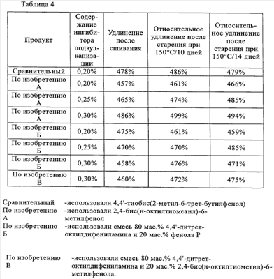 Изобретение относится к полиэтиленовой композиции для изоляции проводов и кабелей, обладающей улучшенным сопротивлением подвулканизации, и состоит из полиэтилена и ингибитора подвулканизации с температурой плавления под атмосферным давлением ниже 50°С, представляющего собой соединение формулы I, в которой R1 обозначает C1-С20алкил или C1-С20алкил, который замещен фенилом, С2-С20алкенил, С3-С20алкинил, С5-С9циклоалкил, фенил или толил; R2 и R3 каждый независимо друг от друга обозначает C1-С20алкил или С1-С20алкил, который замещен следующими радикалами: фенилом, одним или двумя гидроксилами, цианогруппой, формилом, ацетилом, -О-COR5; R5 обозначает C1-С20алкил; С3-С20алкенил; С3-С20алкинил; С5-С7циклоалкил или С5-С7циклоалкил, который замещен гидроксилом; фенил, 4-хлорфенил, 2-метоксикарбонилфенил, п-толил, 1,3-бензтиазол-2-ил или -(CHR6)nCOOR7 или -(CHR6)nCON R8R9, где n обозначает 1 или 2, R6 обозначает водородный атом или C1-С6алкил, R7 обозначает С1-С20алкил, С1-С20алкил, прерываемый 1-5 атомами О или S, С5-С7циклоалкил, фенил, бензил, толил, R8 и R9 каждый обозначает водородный атом или C1-С6алкил; R4 обозначает водородный атом или метил и органический пероксид; где композицию можно экструдировать с минимумом предварительной сшивки, даже при достаточной скорости сшивания. Описана также полиэтиленовая композиция для изоляции проводов и кабелей, обладающая улучшенным сопротивлением подвулканизации и содержащая помимо вышеперечисленных компонентов дополнительно также амин, выбранный из группы, включающей дифениламин, 4-трет-бутилдифениламин, 4-трет-октилдифениламин, 4,4′-дитрет-бутилдифениламин, 2,4,4′-тристрет-бутилдифениламин, 4-трет-бутил-4′-трет-октилдифениламин, о,о’-, м,м’- или п,п’-дитрет-октилдифениламин, 2,4-дитрет-бутил-4′-трет-октилдифениламин, 4,4′-дитрет-октилдифениламин, 2,4-дитрет-октил-4′-трет-бутилдифениламин; где композицию можно экструдировать с минимумом предварительной сшивки, даже при достаточной скорости сшивания. Раскрыт способ приготовления сшитой полиэтиленовой композиции. Техническим результатом является рост устойчивости против преждевременной вулканизации при одновременном сохранении удовлетворительной скорости вулканизации и плотности образующихся поперечных сшивок. 3 н. и 4 з.п. ф-лы., 5 табл.