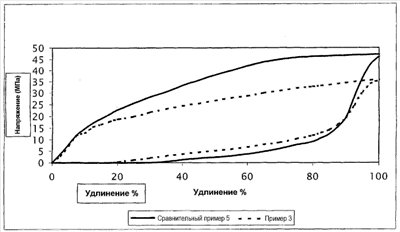 Такое поведение подтверждается оценкой кривых гистерезиса, приведенных на чертеже диссипированная энергия (определяемая площадью между кривыми с нагрузкой и без нагрузки) значительно больше для кривой, отвечающей наполненной композиции, известной из уровня техники (сравнительный пример 5), чем соответствующая величина для примера 3 (87% против 71% соответственно).