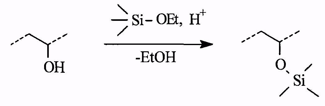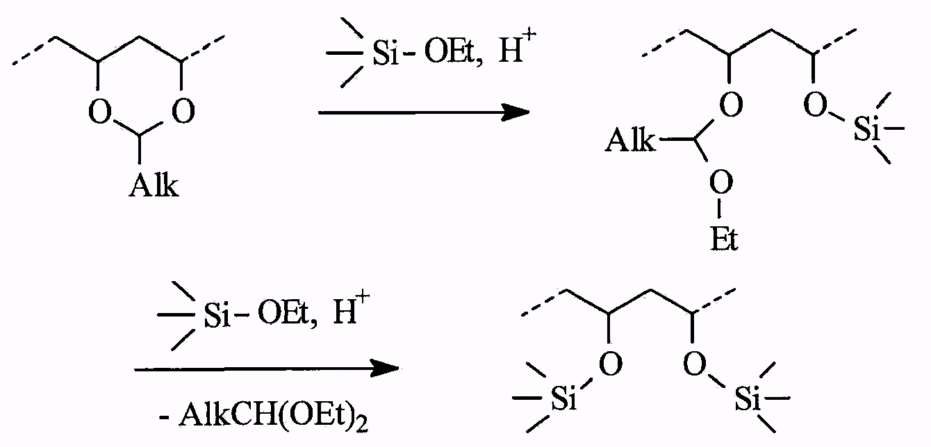 0,47 г поливинилбутираля, содержащего 18 и 2 мас.% остаточных спиртовых и ацетатных звеньев соответственно (Aldrich, #19,097-7), растворяли в 6,699 г этанола, (азеотропная смесь, 4% воды), смешивали с 1,42 г триэтоксиметилсилана, добавляли 0,02 г 1 М соляной кислоты и 0,08 г воды перемешивали на магнитной мешалке при кипячении в течение 2 ч, охлаждали при перемешивании.