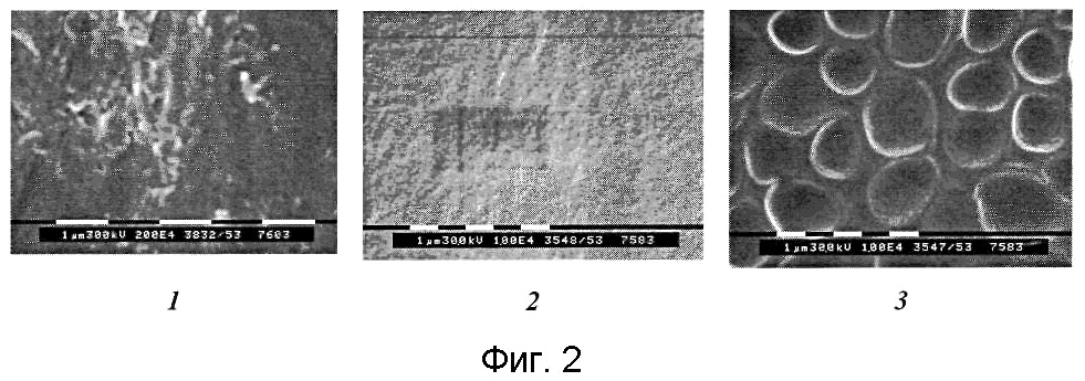 Фиг.2 показывает данные сканирующей электронной микроскопии композиционных покрытий: покрытие на полистироле (1), на стекле (2) и свободная пленка (3).
