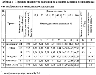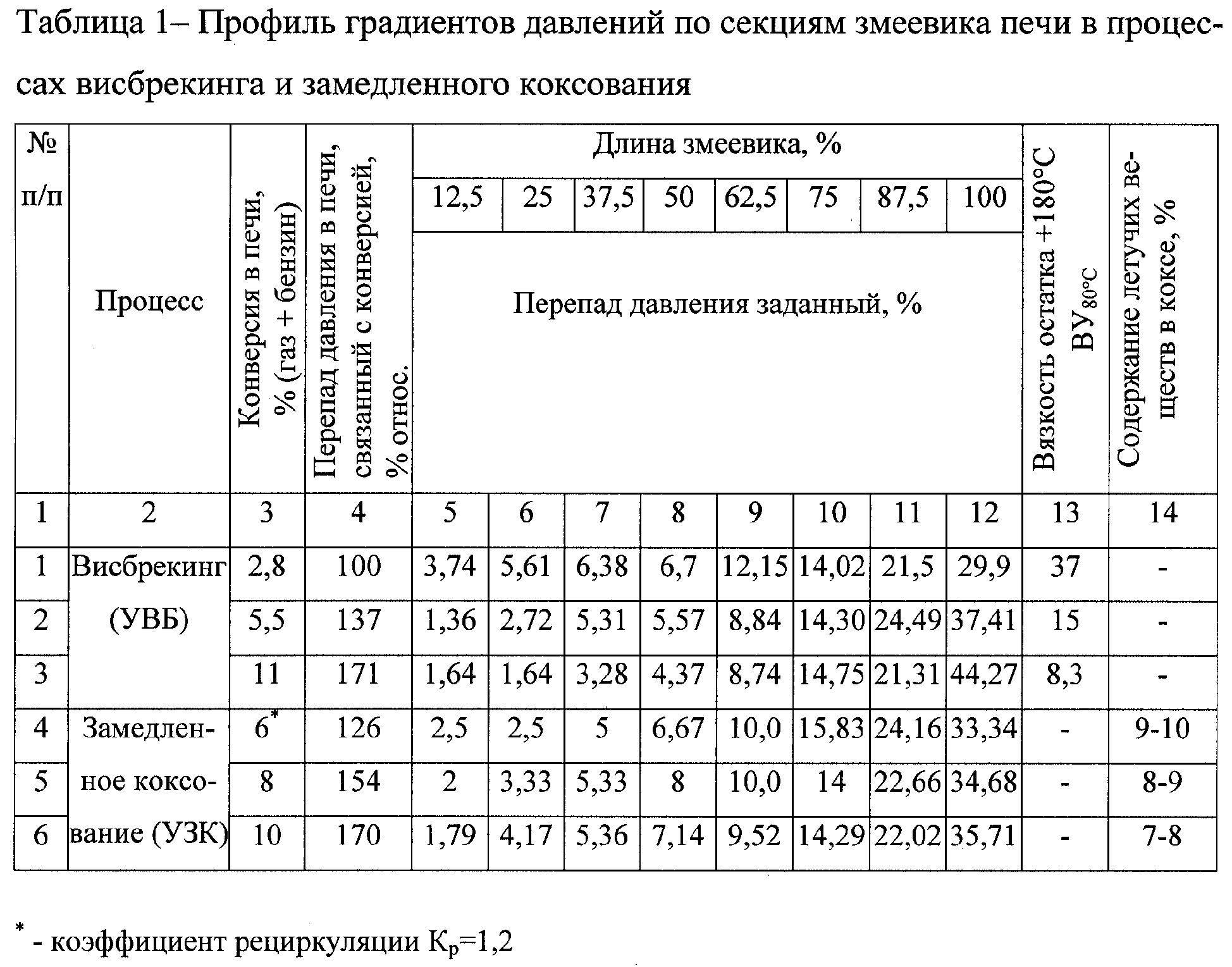1. Способ регулирования процесса термодеструкции нефтяных остатков в змеевике печи, включающий измерение градиента между двумя параметрами на входе и выходе из каждой секции печи, сравнение фактического градиента с заданным и, в зависимости от величины рассогласования, уменьшение этой величины путем изменения расхода топлива к горелкам соответствующей секции, отличающийся тем, что в качестве градиента между двумя параметрами используют градиент давлений, а заданный градиент давлений для каждой секции змеевика печи вычисляют по формуле