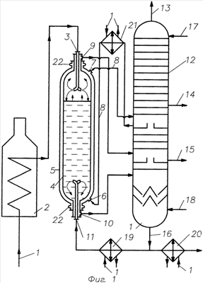 Сырье – нефтяные остатки 1, предварительно подогретое в теплообменниках 19, 20, 21, поступает в печь 2, где оно нагревается за счет сжигания топлива до температуры 460-550°С. Термообработанное сырье по патрубку 3 вводят в верхнюю часть реактора 4 с рубашкой охлаждения 5 для продолжения термодеструкции нефтяных остатков за счет тепла, аккумулированного в печи 2.