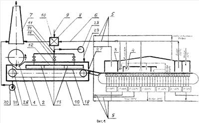 Для выдачи окатышей с транспортерной ленты на роликовый укладчик в торцевой стенке горна выполнено разгрузочное окно 27, снабженное герметичной заслонкой, как вариант – аэродинамическим уплотнителем (завесой). Для нагнетания горячего воздуха в горн предназначены вентилятор 28 и канал 29. Для отсасывания отработанного горячего воздуха служат второй вентилятор 30 и канал 31. Горн снабжен смотровым и рабочим окнами (на схеме не показаны).