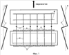 Большая МГД-устойчивость электролизера связана с минимизацией вертикального магнитного поля в ванне электролизера. Отметим основные недостатки конфигурации магнитного поля при использовании ошиновки без компенсационных шин. Как показывает детальное математическое моделирование, вертикальное магнитное поле имеет две доминанты. Прежде всего мы должны обратить внимание на наиболее ярко выраженную асимметрию по длинной оси электролизера. Вертикальная компонента магнитного поля примерно по линейному закону нарастает с одного торца электролизера к другому торцу. Кроме того, можно отметить аналогичное поведение магнитного поля и по самой поперечной координате. Вблизи торцов вертикальное магнитное поле на выходной стороне электролизера по абсолютной величине превышает поле на входной стороне. Оно отражает «пропеллерный» характер вертикального поля от блюмсов. Необходимо отметить, что этот эффект на фоне изменения магнитного поля вдоль длинной стороны электролизера выражен не очень значительно. Компенсация большого магнитного поля в углах ванны на выходной стороне электролизера может обеспечиваться токами, схема которых приведена на фиг.2. Здесь отмечены два механизма коррекции магнитного поля. Первый из них связан с пропусканием тока вдоль торцевых сторон электролизера для коррекции поля вдоль длинной оси электролизера. Второй механизм связан с токами, которые протекают вдоль выходной стороны электролизера по направлению к центру для компенсации неоднородности вдоль короткой оси электролизера.