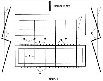 Предлагаемая конструкция ошиновки электролизера включает анодные стояки 1, расположенные вдоль продольной входной стороны последующего электролизера, сборные шины с катодными спусками 2 на входной и 3 на выходной продольных сторонах электролизера. Ток с входной стороны электролизера передается с помощью шин 4, проложенных под днищем электролизера, на анодные стояки, а с выходной стороны – по шинам 5. Анодные стояки подключены к анодным шинам 6. Компенсационные шины 7 приближены к торцу электролизера на выходной стороне и удалены на входной стороне. Расположение компенсационной шины 8 по прототипу.