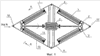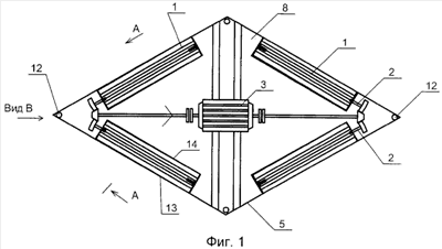 На чертежах представлено устройство для сбора нефти и нефтепродуктов с поверхности воды, на фиг.1 – план (в качестве примера многоугольник в виде ромба, при размещении нефтепродуктосборного барабана на всех четырех сторонах), на фиг.2 – вид В фиг.1, а на фиг.3 – разрез по А-А фиг.1.