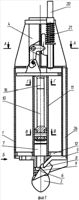 Кроме того, механизм фиксации включает в себя проушину 22, закрепленную на упорном диске 15 так, что в рабочем положении снаряда проушина выведена через отверстие 23 в крышке 24 колонковой трубы наружу в зону переходника, как это показано на (фиг.1, 2). На переходнике поворотно закреплен двуплечевой кулачок 25, одно плечо которого выполнено с крюком для захвата проушины и со скошенной гранью, а другое шарнирно связано с толкателем так, что при сжатии пружины 21 происходит поворот двуплечевого кулачка в сторону крышки 24 трубы 1, в результате которого другое плечо этого рычага выходит из проушины, освобождая полый вал с буром и обеспечивая им возможность перемещения вниз при поднятом над землей за переходник снаряде.