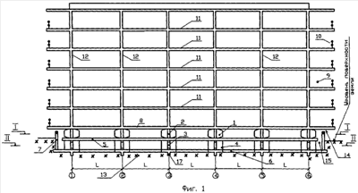 Фиг.1: как пример приведен вертикальный разрез здания; перекрытия – 11 (число этажей здесь принято для примера равным шести); сплошная фундаментная плита 6 имеет ребра 17, идущие вдоль и поперек здания в тех местах в плане, где имеются кинематические стены 4 и их ребра 3; на промежуточной плите 5 располагаются кинематические стены 2 и их ребра 1; на этих стенах лежит надцокольная плита 8, на которой возводятся вертикальные несущие конструкции 12 (колонны или стены); по контуру фундаментной плиты идет подпорная стенка 7, имеющая зазоры 14 и 17 для обеспечения свободного качения здания; позициями 9 и 10 обозначены лоджии и ограды соответственно; шаг L разбивочных осей может быть и переменным; позиция 13 – основание, на которое сажается здание.
