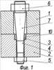 При затяжке гаек 5 узла соединения цилиндрические втулки 3, не связанные с деталью 1, на которые действуют внутренние давления от конической части стержней 7 шпилек 4, легко расширяются в радиальном направлении и защемляются в цилиндрических выточках 10 детали 2. После этого производится затяжка гаек 6. Таким образом, в этой конструкции обеспечивается защемление стержней 7 шпилек 4 и цилиндрических втулок 3 в детали 2, а также защемление опорных поверхностей гаек 6 в детали 1.