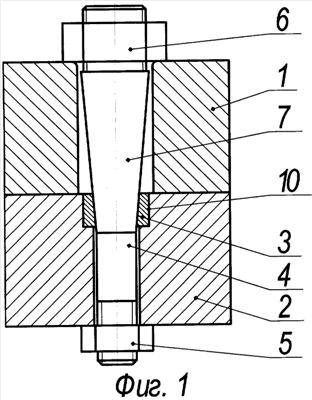 При работе узла соединения внешняя нагрузка будет передаваться равномерно на все цилиндрические втулки 3, установленные плотной посадкой в цилиндрических выточках 10 детали 2, и шпильки 4 за счет их жесткого защемления по сопрягаемым коническим поверхностям и защемления опорных поверхностей гаек 6 в детали 1. Таким образом, в предлагаемом узле соединения упрощается технология изготовления и сборки, а также повышается жесткость всей конструкции.