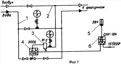 При прекращении подачи сжатого воздуха полностью прекращается и подача воды к форсункам. В схему регулирования системы доувлажнения (фиг.1), помимо ЭПРД, входит датчик влажности 5 ЭВЧ с регулятором 6 СПР-104. Датчик регулятора устанавливается в характерной точке цеха. При влажности воздуха выше заданной регулятор СПР-104 подает командный импульс на катушку 7 регулятора ЭПРД (фиг.2), вспомогательный клапан 8 открывается, и пространство над мембраной сообщается с атмосферой, который связан с основным 9 посредством мембранного блока, состоящего из полостей А и Б.