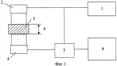 На схеме обозначены: 1 – генератор, 2 – излучающий пьезопреобразователь, 3 – исследуемый образец, 4 – приемник, 5 – цифровой осциллограф, 6 – вычислительное устройство.