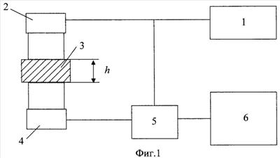 На фиг.1 показана блок-схема, реализующая предлагаемый способ. На схеме обозначены: 1 – генератор, 2 – излучающий пьезопреобразователь, 3 – исследуемый образец, 4 – приемник, 5 – цифровой осциллограф, 6 – вычислительное устройство.
