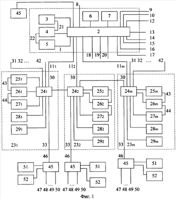 Вторые входы-выходы первого пульта управления 3 посредством первой 21 линии внутренней связи соединены со вторыми входами-выходами второго 4 пульта управления, третьи входы-выходы которого посредством второй 22 линии внутренней связи соединены со вторыми входами-выходами третьего пульта управления 5. Вторые входы-выходы третьего пульта управления 5 могут быть соединены с третьими входами-выходами первого пульта управления 3.