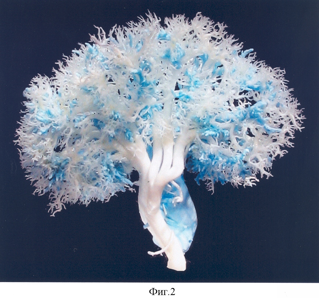 Для получения рентгеноконтрастного препарата артерий органов брюшной полости животного (кошки) мы использовали смесь: 15 мл герметика силиконового универсального белого; эфир для наркоза стабилизированный 15 мл; рентгеноконтрастное вещество – углекислый свинец 10 г; в качестве красителя добавляли по каплям до необходимой окраски метиленовый синий. Компоненты тщательно смешали между собой. Смесь ввели с помощью пластмассового одноразового шприца в брюшной отдел аорты. После этого инъецированные органы помещали на 24 часа в термостат при температуре +40°С. В дальнейшем препарат извлекаем и помещаем в воду (температура воды +25 – +35°С) на 24 часа. Препарат опускаем в 15% раствор соляной кислоты (приготовленный путем смешивания 50 об.% кислоты и 50 об.% дистиллированной воды) на 24-48 часов. Промываем под струей проточной воды для удаления остатков органических тканей. Помещаем препарат в термостат на 6-12 часов при температуре 30-40°С (фиг.2).