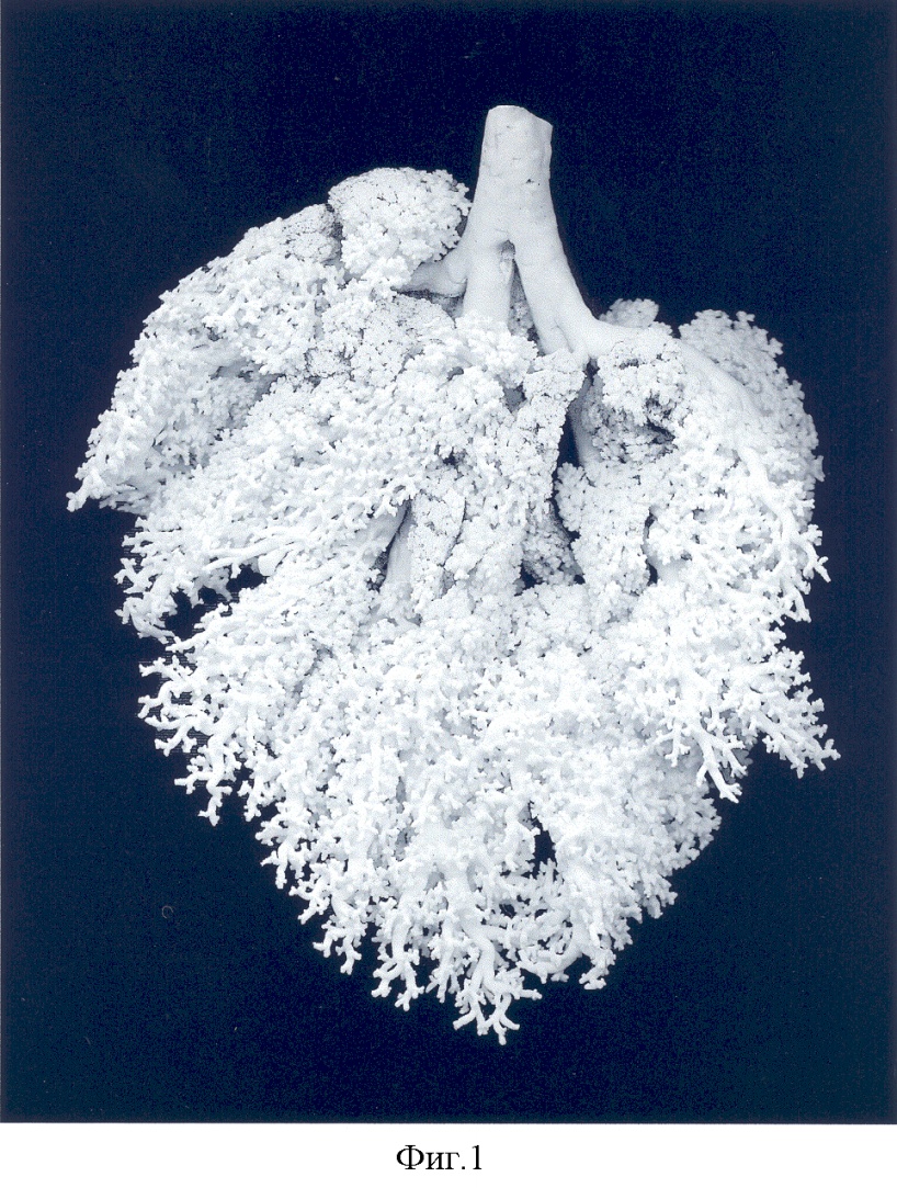 Для получения коррозионного препарата бронхиального дерева человека нами было приготовлено 60 мл смеси. В состав смеси входили следующие компоненты: 30 мл герметика силиконового универсального белого, эфир для наркоза стабилизированный 10 мл (диэтиловый эфир ГОСТ 84-2066-88), рентгеноконтрастное вещество – углекислый свинец 10 г, в качестве красителя добавляли по каплям до необходимой окраски метиленовый синий. Компоненты тщательно смешивали между собой. Смесь вводили пластмассовым одноразовым шприцем с помощью полимерной трубки в трахею (органокомплекс получен методом препаровки). После этого инъецированные трахею, бронхи и легкие помещали на 24 часа в термостат при температуре +40°С. В дальнейшем препарат извлекаем и помещаем в воду (температура воды +25 – +35°С) на 24 часа. Препарат опускаем в 15% раствор соляной кислоты (приготовленный путем смешивания 50 об.% кислоты и 50 об.% дистиллированной воды) на 24-48 часов. Промываем под струей проточной воды для удаления остатков органических тканей. Препарат погружаем в раствор гипохлорида натрия на 4-5 часов при температуре 20-22°С для отбеливания препарата и в качестве дезинфицирующего средства. Помещаем препарат в термостат на 6-12 часов при температуре 30-40°С (фиг.1).
