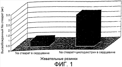 Результаты исследований показаны на графике фиг.1. Как показано на фиг.1, количество стеарата натрия, высвобождаемое из образцов жевательной резинки, содержащих комплекс стеарата натрия/ -циклодекстрина, как обнаружено, является значительно более высоким, чем количество стеарата натрия, высвобождаемое из образцов жевательной резинки, содержащих свободный стеарат натрия. На основе результатов, комплекс стеарата натрия/ -циклодекстрина демонстрирует значительное увеличение высвобождения стеарата натрия из жевательной резинки во время жевания.