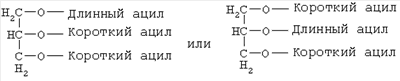В некоторых вариантах выполнения предпочтительно, чтобы короткие ацильные группы содержались в максимальном количестве по сравнению с полным количеством глицерина и его сложных эфиров, содержащихся в композиции. Предпочтительно, чтобы короткие ацильные группы содержались в количестве, в среднем составляющем не более 2 моль/моль глицерина и его сложных эфиров, содержащихся в композиции.