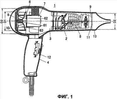 На фиг.1 показан вид в разрезе фена для волос, выполненного в соответствии с настоящим изобретением.