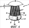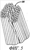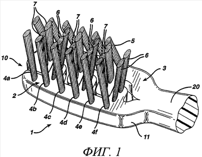 Пучки 4, 5, 6 и 7 предпочтительно имеют поперечные сечения прямоугольной формы с соотношением сторон – длины и ширины прямоугольника – от 1:2 до 1:6. Более предпочтительно это соотношение сторон составляет от приблизительно 1:3 до 1:4. Также предусматривается использование пучков круглой, прямоугольной, квадратной или любой другой формы, известных специалистам в данной области техники. В наиболее предпочтительном варианте осуществления свободные концы отдельных элементарных волокон 20 выполнены скругленными подобно куполу. Такие концы обычно называют щетинками с закругленными концами.