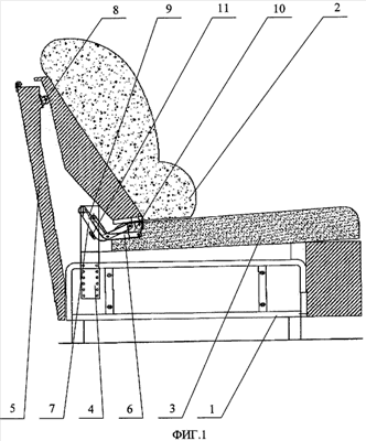 После трансформации сиденья с образованием места для лежания спинка 2 опускается до контакта с сиденьем без образования зазора, как показано на фиг.4.