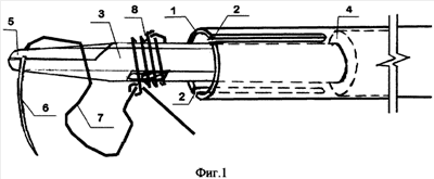 Работают устройством О.Б.Оспанова для эндохирургического прошивания и лигирования следующим образом (по фиг.1).