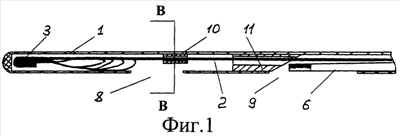 Направляющий элемент 10, внутри которого имеется фиксирующее овальное отверстие для прохождения основного поводка 2, представляет собой сплющенный отрезок металлической трубки с внутренним диаметром 0,30-0,35 и длиной 1-2 мм, жестко закрепленный (например – вклеен) в трубчатом направителе 1 сразу за отверстием 8 (сечение В-В фиг.5). Направляющий элемент 10 предотвращает возможность вращения основного поводка 2 вокруг своей продольной оси, чем определяется строгое позиционирование положения лепестка 5 относительно отверстия 8.