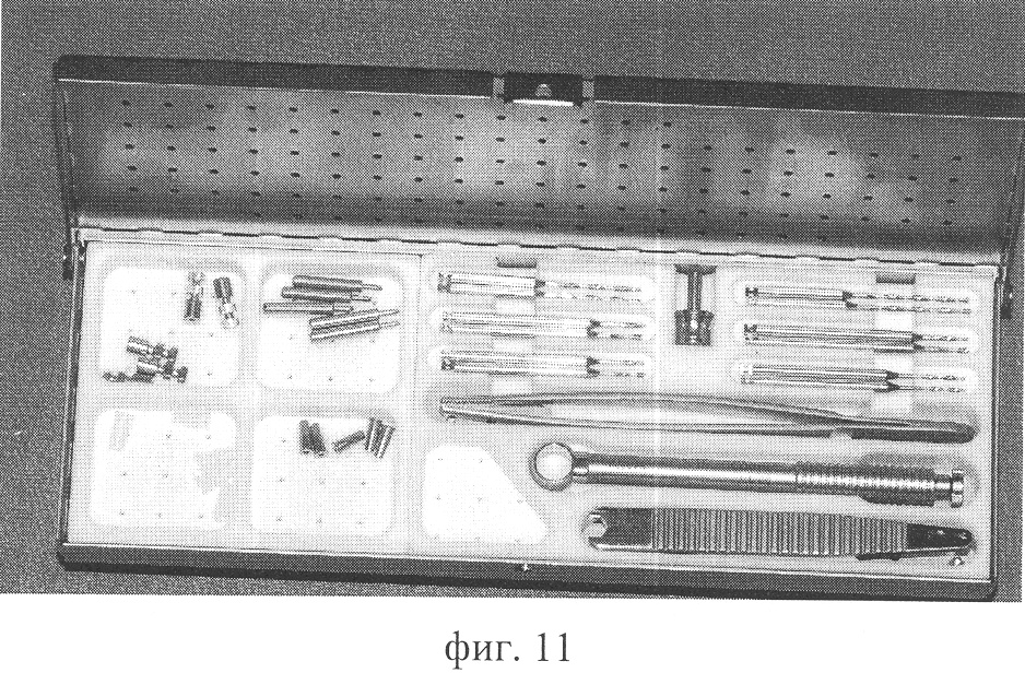 Коробка, представленная на фиг.11, включает пластиковое основание с ложементами для инструмента. Коробка выполнена из титана и пригодна для любых видов стерилизации.