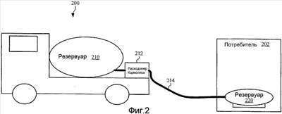 На фиг.2 показано транспортное средство 200 для доставки пропана потребителю 202 согласно примеру настоящего изобретения. Транспортное средство 200 содержит резервуар 210 для пропана, расходомер 212 Кориолиса, и шланг 214. Транспортное средство 200 также может содержать насос, фильтры, клапаны, калибрующую систему или другие признаки, которые для краткости опущены. Потребитель 202 содержит резервуар 220 для пропана. Шланг 214 соединяется с резервуаром 220 для доставки пропана из резервуара 210 в резервуар 220.
