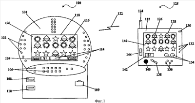 Как пример ведения игры на игровой машине 100 в соответствии с настоящим изобретением игра 116 может быть представлена на дисплее 118, размещенном на игровой машине 100. Игру 116 можно запускать с помощью механизмов ввода типа кнопок ввода 106 или кнопок интерфейса сенсорного экрана 104. Кнопки интерфейса сенсорного экрана 104 активизируют с помощью сенсорного экрана 120, размещенного поверх дисплея 118 игровой машины 100. Далее игра 126 может быть представлена на дисплее 128, размещенном на беспроводном воспроизводящем игровом устройстве 125. Игру 126 можно запускать с помощью механизмов ввода, размещенных на беспроводном воспроизводящем игровом устройстве 125, таких как 138 и 136 или кнопок интерфейса сенсорного экрана 134. Кнопки интерфейса сенсорного экрана 134 активизируют с помощью сенсорного экрана 146, размещенного поверх дисплея 128.