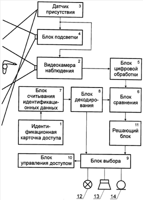 На нем используются следующие обозначения: 1 – идентификационная карточка доступа; 2 – видеокамера наблюдения; 3 – датчик присутствия; 4 – блок подсветки; 5 – блок цифровой обработки; 6 – блок сравнения; 7 – блок считывания идентификационных данных; 8 – блок декодирования; 9 – блок выбора; 10 – блок управления доступом; 11 – решающий блок; 12 – световой индикатор; 13 – динамик; 14 – микрофон.