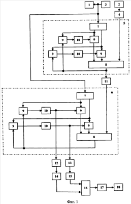 Квадратурные автокомпенсаторы 5 и 6 могут быть реализованы в соответствии со схемой, приведенной, например, в книге Ю.И.Лосева и др. Адаптивная компенсация помех в каналах связи. М.: Радио и связь, 1988, с.38-43. Квадратурные преобразователи 7 автокомпенсаторов могут быть выполнены в виде фазовращателей на 90° (см., например, Ж.Марше. Операционные усилители и их применение. Перевод с английского М.: Радио и связь, 1984, с.97, рис.2.14). Сумматоры 8 автокомпенсаторов могут быть выполнены на операционных усилителях по схеме инвертирующего сумматора (см., например, Ю.А.Мячин. 180 аналоговых микросхем. М.: Патриот, 1993, с.7). Перемножители 9 автокомпенсаторов могут быть реализованы с использованием специализированных микросхем К525ПС2 (см., например, А.Г.Алексенко и др. Применение прецизионных аналоговых микросхем. М.: Радио и связь, 1985, с.79, рис.1.43). Фильтры 10 нижних частот автокомпенсаторов могут быть реализованы, например, в виде обычных RC-цепей с заданными постоянными времени.