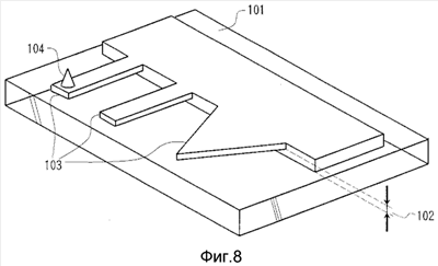 (1) Сначала, как показано на фиг.18(А), свободный конец 1101 кантилевера выполняют из тонкой пленки монокристаллического кремния и формирование его осуществляют способом изготовления из шестого варианта осуществления. Необходимо, чтобы эта тонкая пленка монокристаллического кремния было образована из плоскости (100) и чтобы свободный конец 1101 кантилевера был ориентирован в направлении <110>. Боковые поверхности 1102 и заднюю поверхность (соответствующую задней плоскости бумаги) этого кантилевера защищают пленкой нитрида кремния или пленкой оксида кремния. Для образования указанной пленки можно осадить пленку на весь кантилевер, после чего протравить верхнюю поверхность, или может быть использована пленка, осажденная после этапов, показанных на фиг.16(В) или 17(В).