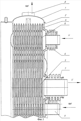 а каналы, образованные отверстиями соединенных пластин на периферии и в центре, через сильфоны соединены с патрубками в корпусе теплообменника для подключения к трубопроводам для подачи лития от реактора-преобразователя,