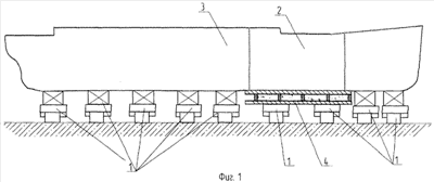На фиг.1 изображены доковые опорные устройства 1 стапеля, на которых в районе расположения радиоактивного блока 2 объекта 3 установлено основание 4 транспортной упаковки.