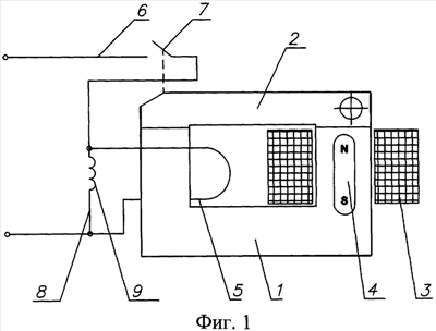 При аварийном режиме происходит резкое увеличение тока. При этом индуктивное сопротивление 9 препятствует резкому увеличению тока в дополнительной токоведущей шине. Так как основная и дополнительная токоведущие шины соединены параллельно, происходит перераспределение тока нагрузки между шинами, а именно увеличение тока, протекающего через основную токоведущую шину, и соответственно уменьшение тока, протекающего через дополнительную токоведущую шину. Следовательно, на момент резкого возрастания тока в нагрузке происходит снижение тока уставки выключателя, что приводит к более раннему отрыву якоря от магнитопровода, раньше, чем ток в нагрузке достигнет значения тока уставки выключателя.