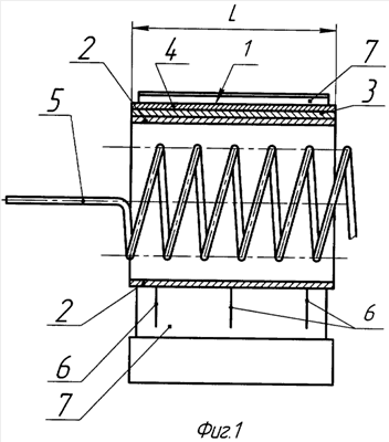 Как показано на фиг.1, элементарный ленточный катод 1 содержит катодный цилиндр 2 длиной L, на котором закреплен керн 3 длиной L, покрытый по всей его длине эмиссионным слоем 4, а также подогреватель 5, установленный в полости катодного цилиндра 2. Элементарный ленточный катод 1 закреплен на трех держателях 6 и размещен вместе с ними в корпусе 7.