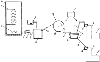Из ванны расплава 22 с помощью распылительного устройства 46 происходит при различных давлениях распыление исходного материала на барабанный охладитель 12, что может осуществляться при различных скоростях вращения, при температуре в интервале от примерно 4°С до примерно 12°С и при необходимости при различных диаметрах.