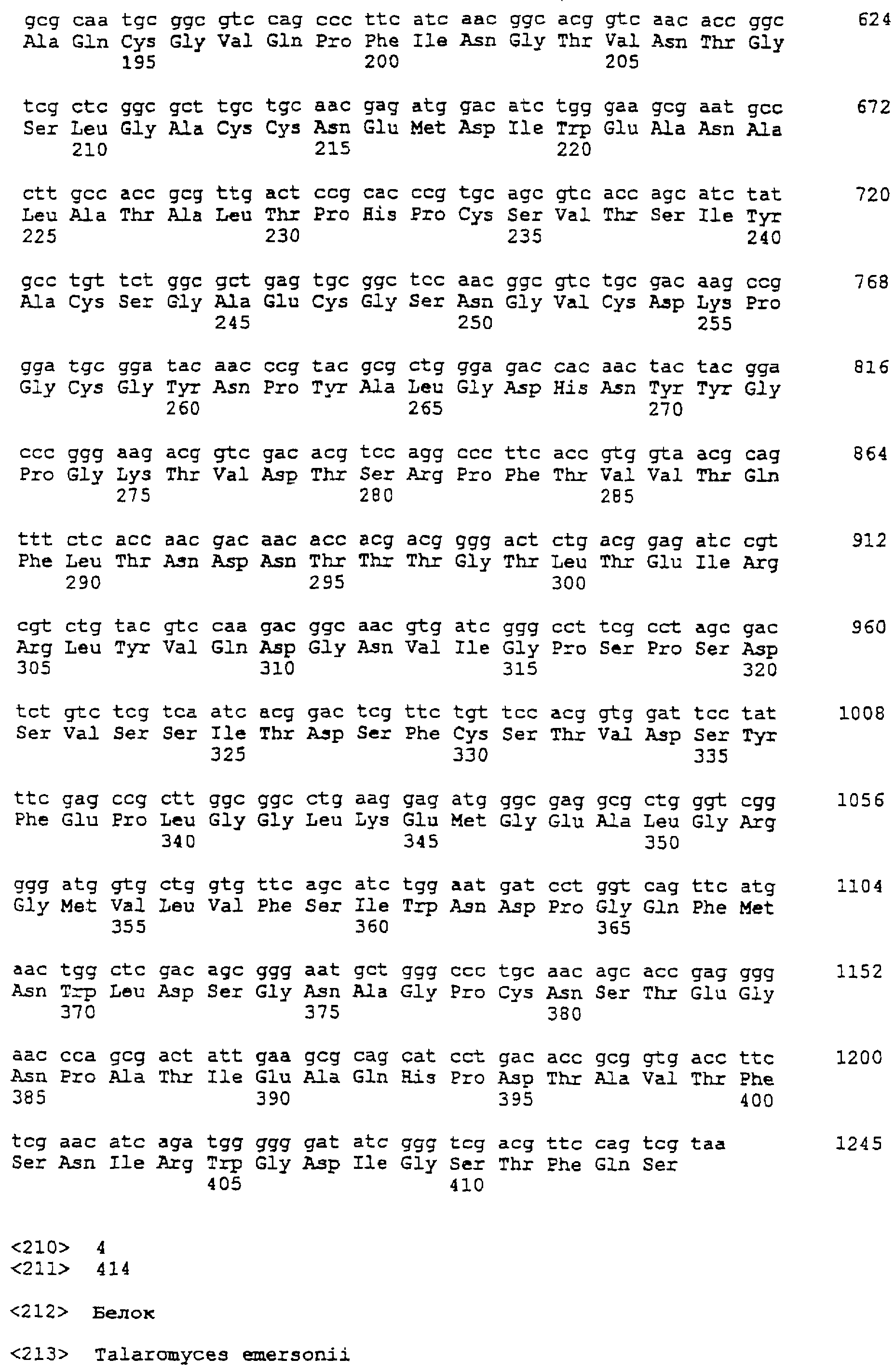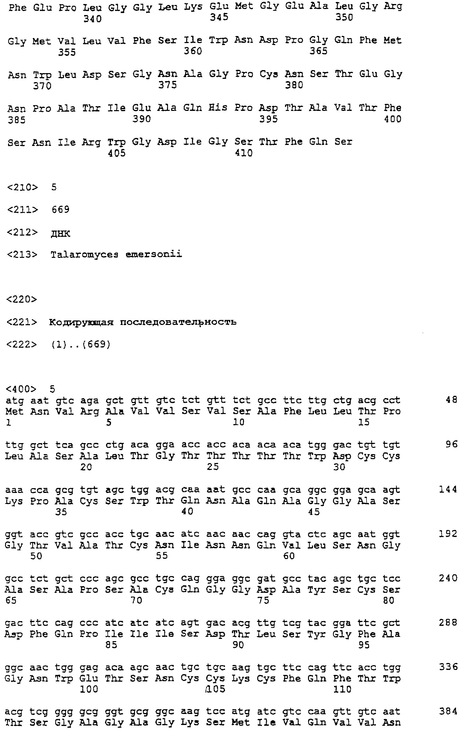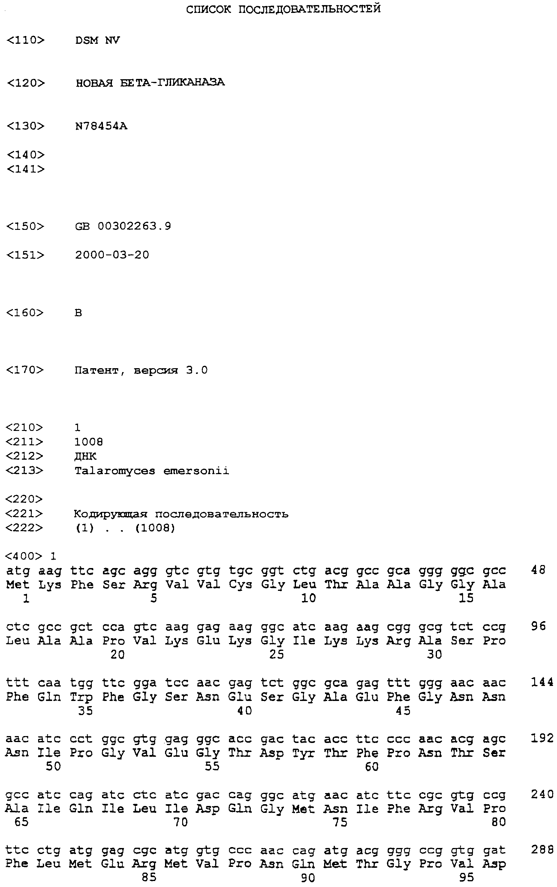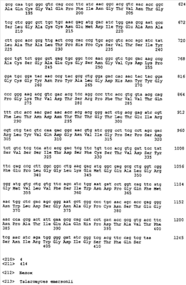 Более короткие полипептидные последовательности входят в рамки изобретения. Например, считается, что пептид длиной, по меньшей мере, 50 аминокислот или до 60, 70, 80, 100, 150 или 200 аминокислот входит в рамки изобретения при условии, что он проявляет основные биологические функции Модификации Полипептиды согласно изобретению могут быть химически модифицированными, например модифицированными пост-трансляционно. Например, полипептиды могут быть гликозилированы (один или несколько раз, одним и тем же или разными сахарами) или содержать модифицированные аминокислотные остатки. Их также можно модифицировать присоединением остатков гистидина (чтобы обеспечить их очистку) или присоединением сигнальной последовательности (чтобы обеспечить встраивание в мембрану клеток). Полипептид может иметь одно или несколько удлинений (N)-амино- или (С)-карбоксильных концов, таких как аминоконцевой остаток метионина, небольшой линкерный пептид длиной примерно до 20-25 остатков или (небольшое) удлинение, которое облегчает очистку, такое как полигистидин или Т7-метка, антигенный эпитоп или связывающий домен (например, мальтозу)14 (например, на С-конце). Указанные удлинения можно присоединять посредством линкера или без него. Полипептид изобретения можно метить регистрируемой меткой. Регистрируемой меткой может быть любая подходящая метка, которая позволяет выявить полипептид. Подходящие метки включают радиоизотопы, например 125I, 35S, ферменты, антибиотики, полинуклеотиды и линкеры, такие как биотин. Полипептиды могут быть модифицированы таким образом, чтобы они содержали аминокислоты неприродного происхождения или чтобы повысить стабильность полипептида. В том случае, когда белки или пептиды получают синтетическими способами, такие аминокислоты можно вводить во время получения. Белки или пептиды также можно модифицировать после получения синтетическим или рекомбинантным способом. Полипептиды согласно изобретению также можно получить с использованием D-аминокислот, или они могут содержать D-аминокислоты (одну или несколько). В данной области известен ряд модификаций боковых цепей, и такие модификации можно осуществить по отношению к боковым цепям белков или пептидов согласно данному изобретению. Такие модификации включают, например, модификации аминокислот восстановительным алкилированием в результате реакции с альдегидом с последующим восстановлением NaBH4, амидированием метилацетимидатом или ацилирование уксусным ангидридом. Последовательности, представленные в данном изобретении, также можно использовать в качестве исходных материалов для конструирования ферментов “второго поколения”. Глюканазы “второго поколения” являются глюканазами, измененными способами мутагенеза (например, сайт-направленного мутагенеза), которые обладают свойствами, отличными от свойств глюканаз дикого типа или рекомбинантных глюканаз, таких как глюканазы, получаемые согласно данному изобретению. Например, оптимум температуры или рН, удельная активность, сродство к субстрату или термостабильность можно изменять для того, чтобы они лучше подходили для применения в определенных способах. Аминокислоты, необходимые для проявления активности глюканаз согласно изобретению и поэтому предпочтительно подлежащие замене, можно идентифицировать согласн